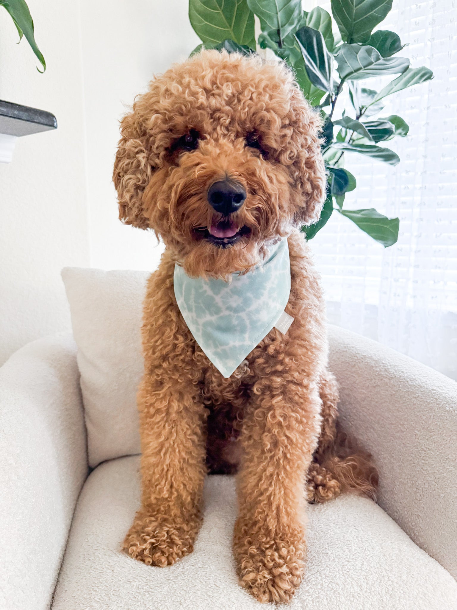 Our bandanas come in the traditional triangle tie-on style, with the option to add on snaps, free of charge. Bandanas come in extra small, small, medium & large (see above size chart). Please measure your dog’s neck (don’t forget to account for any floof) and leave sufficient space to tie the knot! If your pup is in between sizes, I recommend ordering a size up as the bandanas can be folded down for a perfect fit. This will also allow more print visibility.