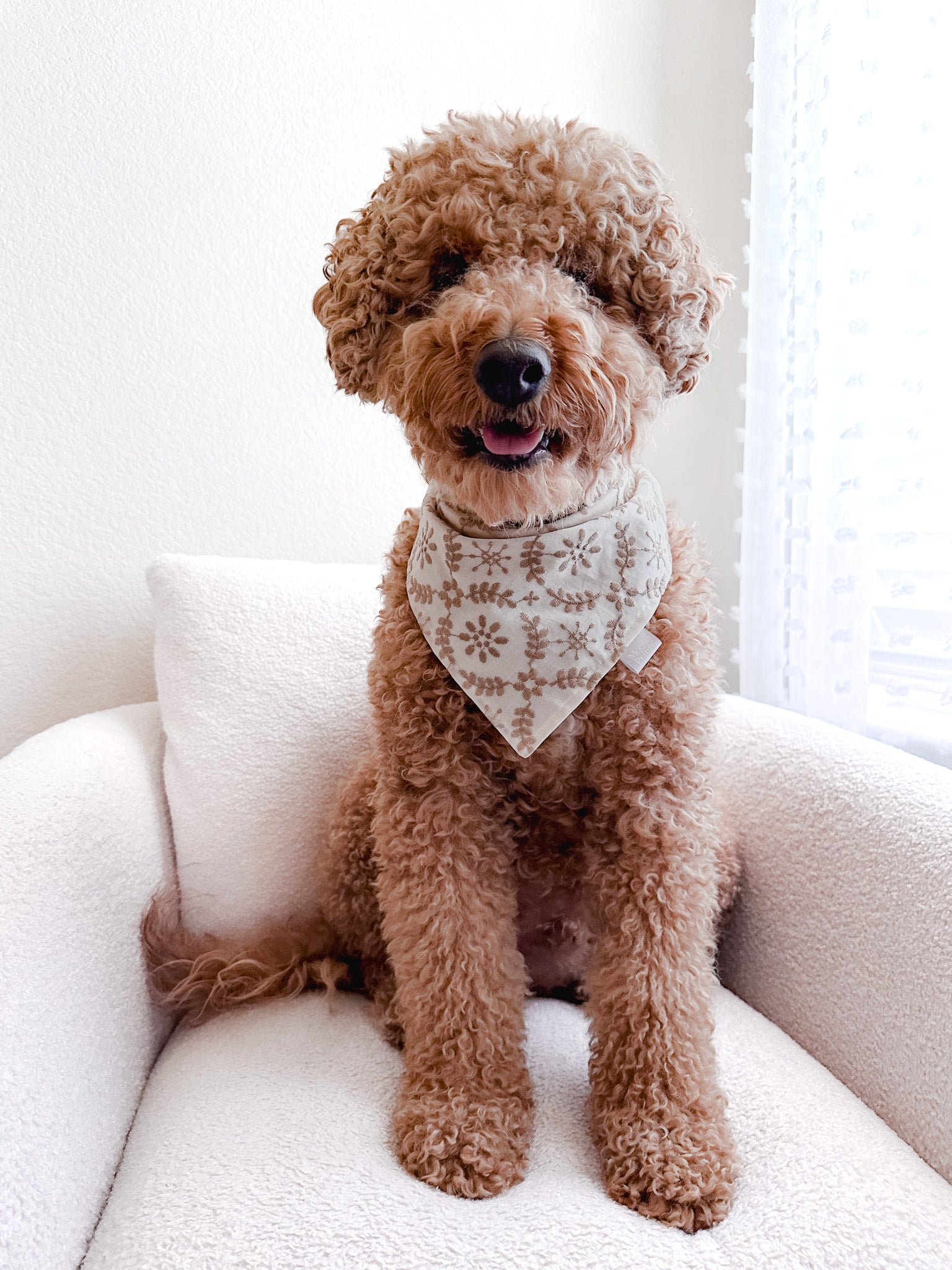 Our bandanas come in the traditional triangle tie-on style, with the option to add on snaps, free of charge. Bandanas come in extra small, small, medium & large (see above size chart). Please measure your dog’s neck (don’t forget to account for any floof) and leave sufficient space to tie the knot! If your pup is in between sizes, I recommend ordering a size up as the bandanas can be folded down for a perfect fit. This will also allow more print visibility.