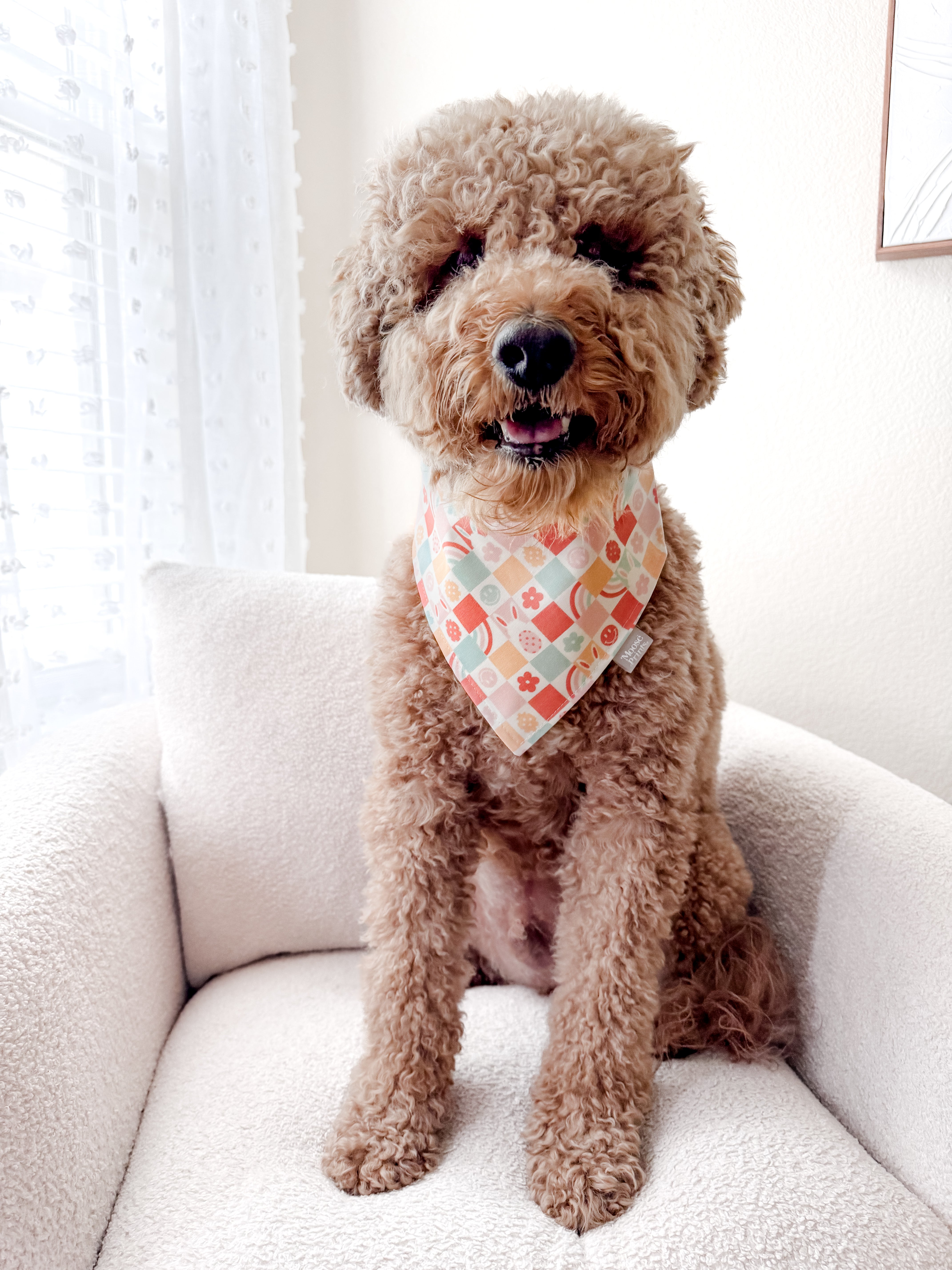 Our bandanas come in the traditional triangle tie-on style, with the option to add on snaps, free of charge. Bandanas come in extra small, small, medium & large (see above size chart). Please measure your dog’s neck (don’t forget to account for any floof) and leave sufficient space to tie the knot! If your pup is in between sizes, I recommend ordering a size up as the bandanas can be folded down for a perfect fit. This will also allow more print visibility.