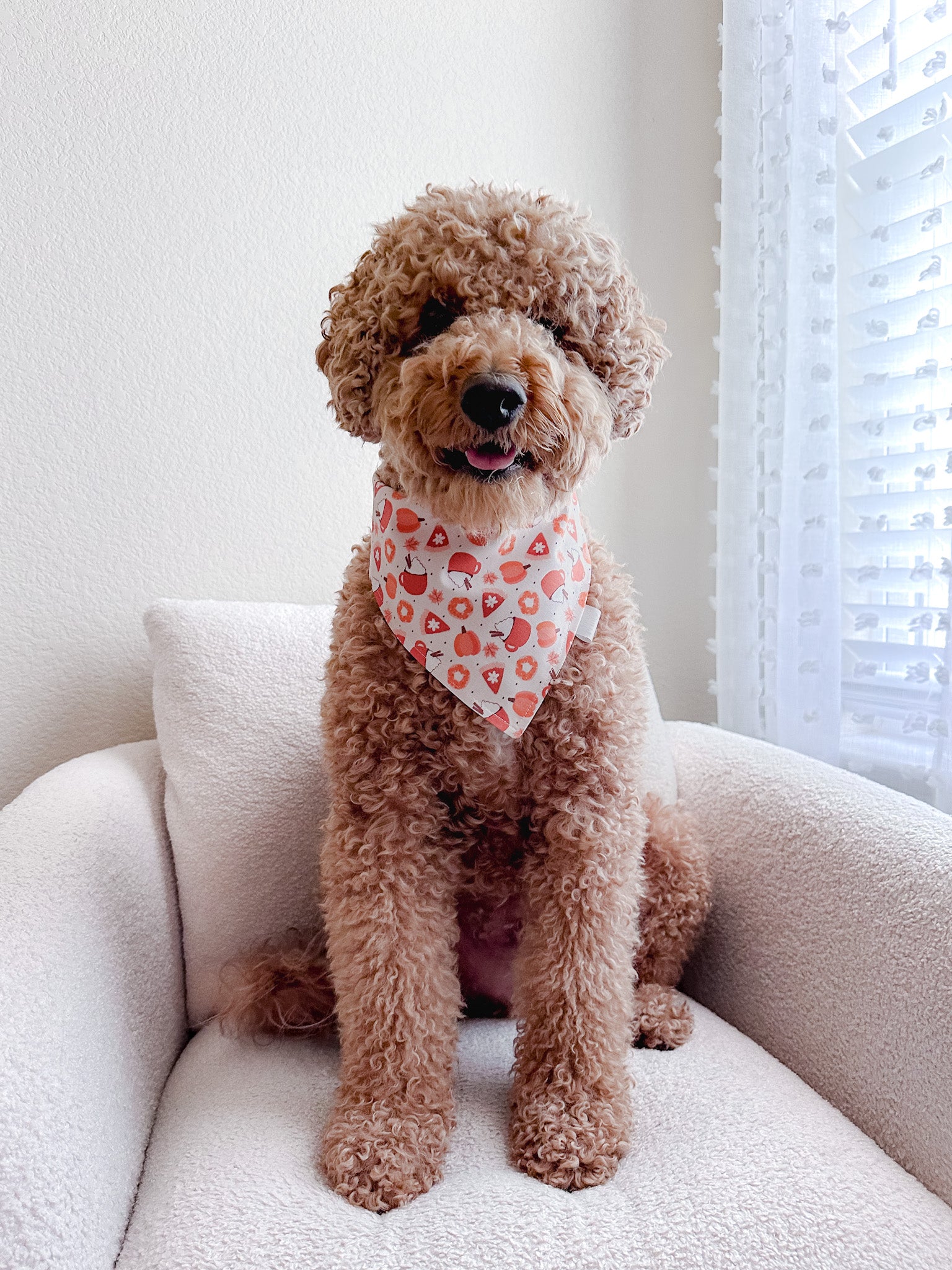Our bandanas come in the traditional triangle tie-on style, with the option to add on snaps, free of charge. Bandanas come in extra small, small, medium & large (see above size chart). Please measure your dog’s neck (don’t forget to account for any floof) and leave sufficient space to tie the knot! If your pup is in between sizes, I recommend ordering a size up as the bandanas can be folded down for a perfect fit. This will also allow more print visibility.